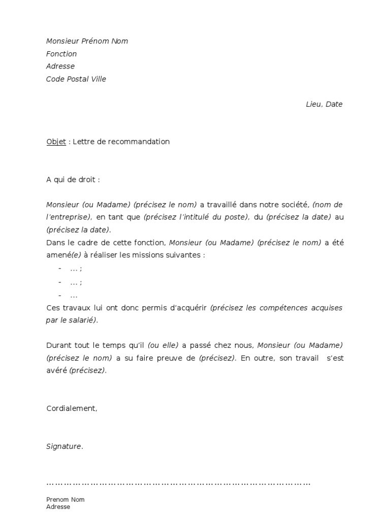 23 janvier 2007 lettre de change. Si vous mentionnez plus d'un incident, divisez-le en 2 paragraphes différents et terminez le paragraphe avec les qualités qui doivent être mises en évidence avec chaque exemple. Si on vous a déjà demandé d'écrire une lettre de recommandation de personnage, vous connaissez l'anxiété que cette demande peut créer. La première pensée est généralement "comment diable en écrivez-vous ?" Et cette pensée est rapidement suivie d'une question du type "que dois-je dire ?" Et "Et si je dis la mauvaise chose et faire mal paraître la personne ?"